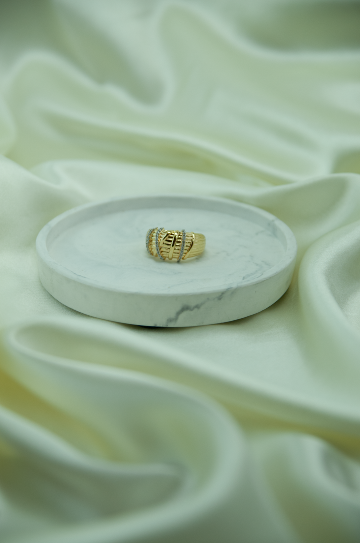 Kademeli geometrik çizgileri ve kabartmalı dokusu ile dikkat çeken, modern ve güçlü bir stil sunan altın renk çelik yüzük.
