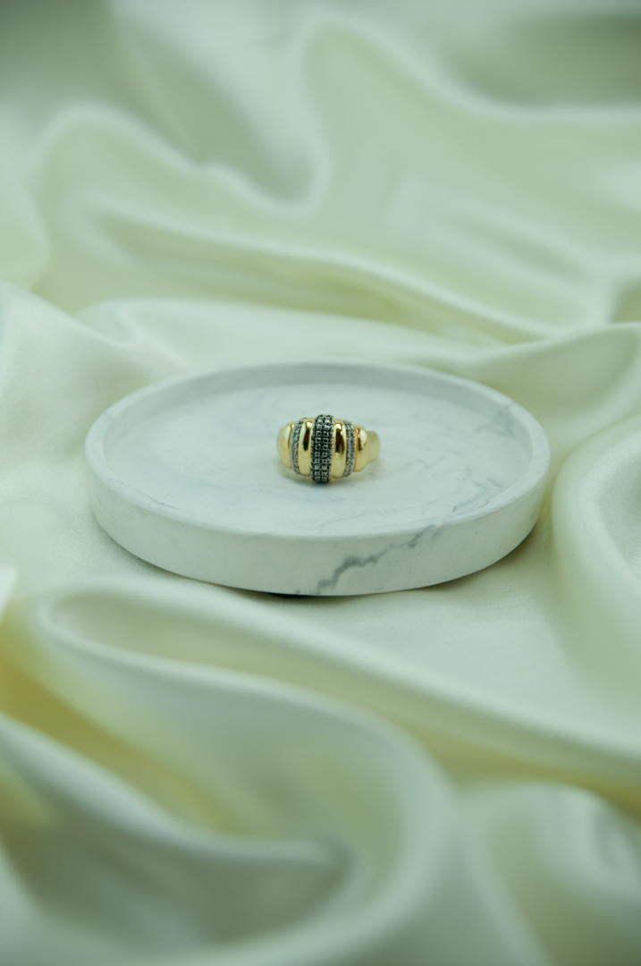 Siyah Taşlı Gösterişli Altın Renk Çelik Yüzük Orta bölümdeki siyah taş dizilimiyle öne çıkan, hem şık hem iddialı bir görünüm yaratan gösterişli çelik yüzük.