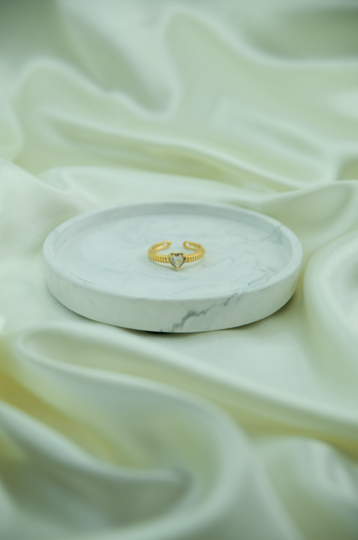 Merkezdeki parlak oval taşla feminen bir görünüm sunan, ince ve zarif altın renk çelik yüzük.