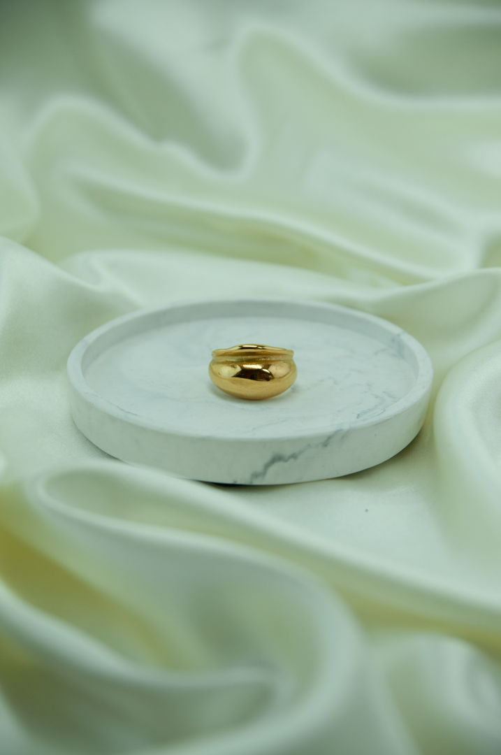 Zarif bombeli formu ile modern ve sade bir şıklık sunan, günlük kullanıma uygun parlak altın renk çelik yüzük