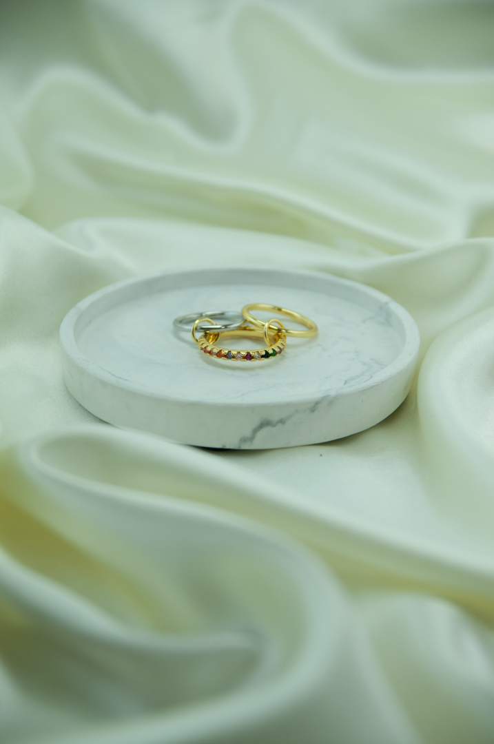 Üzerindeki mini renkli taşlarla göz alıcı bir görünüm sunan, modern ve enerjik bir altın renk çelik yüzük.