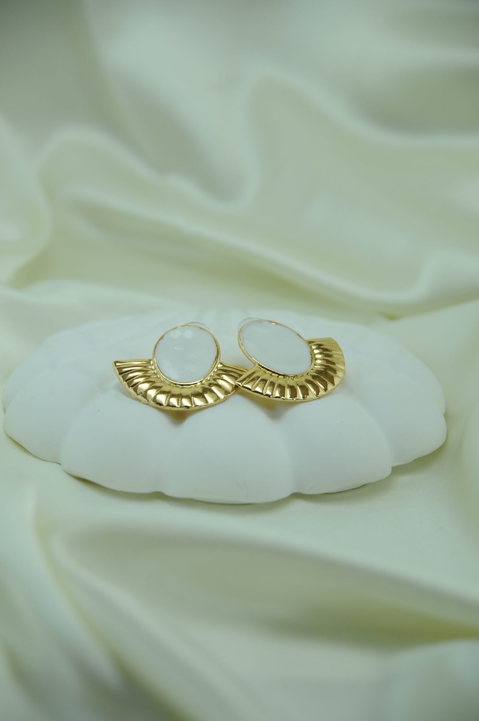 Beyaz mine taşının gold renkli yelpaze formundaki metal detaylarla birleştiği bu çarpıcı küpe, stilinize etnik ve retro bir zarafet katıyor. İddialı boyutu ve parlak görünümü sayesinde, sade kıyafetlerinizi anında şık bir görünüme dönüştüren odak noktası bir aksesuardır.