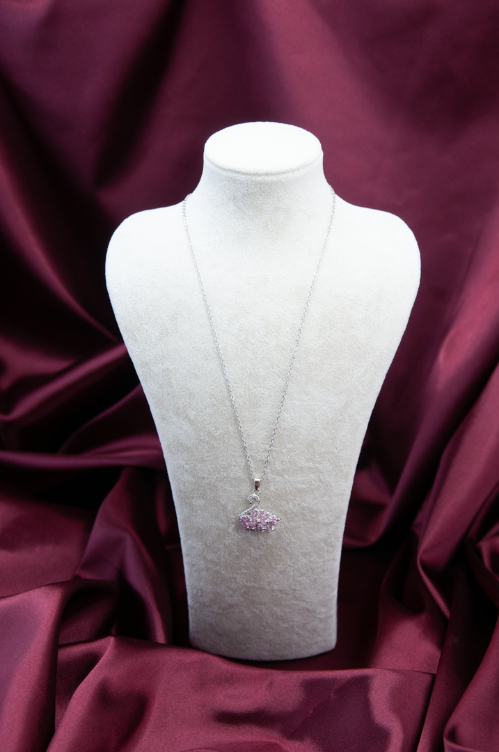 • Tasarım ve İşçilik: Kuğu figürünün gövdesini süsleyen lila ve şeffaf kristal taşlar, ışığı mükemmel şekilde yansıtarak kolyeye derinlik ve canlılık kazandırır.