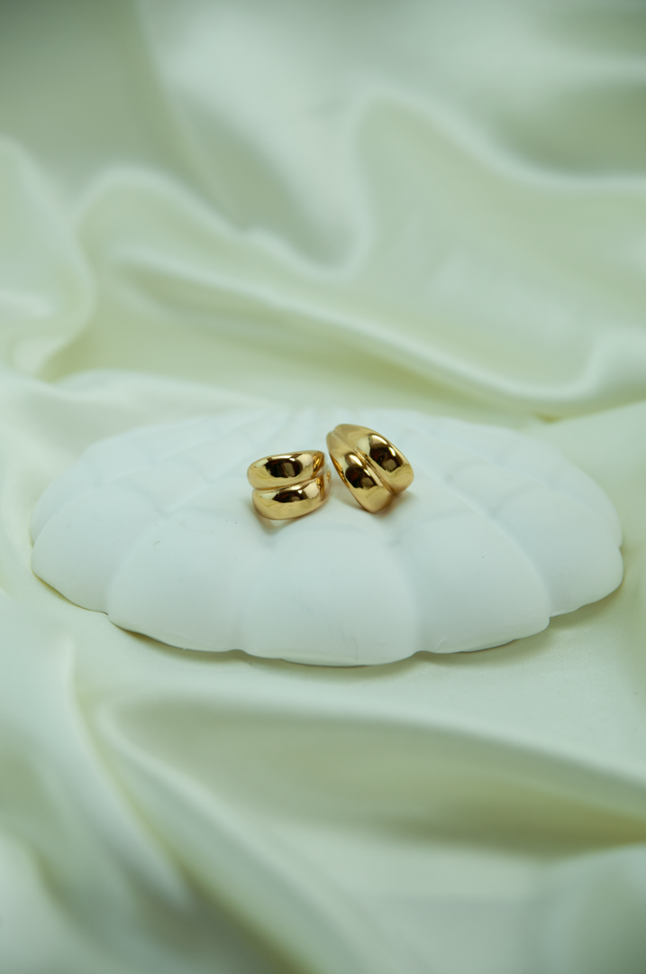 İç içe geçmiş iki bombeli gold halkanın birleşimiyle tasarlanmış bu küpe, tek bir parçada hacimli ve katmanlı bir görünüm sunar. Pürüzsüz ve parlak gold yüzeyi sayesinde hem modern hem de lüks bir duruş sergiler.