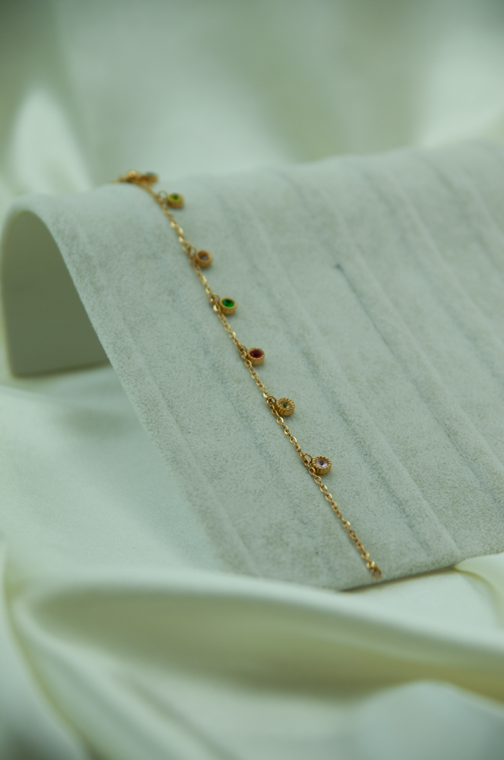 Paslanmaz çelik zincir üzerine sıralanan rengarenk zirkon taşlı sallantılarla tasarlanan bu şık bileklik, bileğinizde neşeli ve dinamik bir hava estirir. Kararmayan çelik yapısı sayesinde uzun ömürlü ve canlı görünümünü koruyarak günlük stilinize renkli bir ışıltı katmak için idealdir.