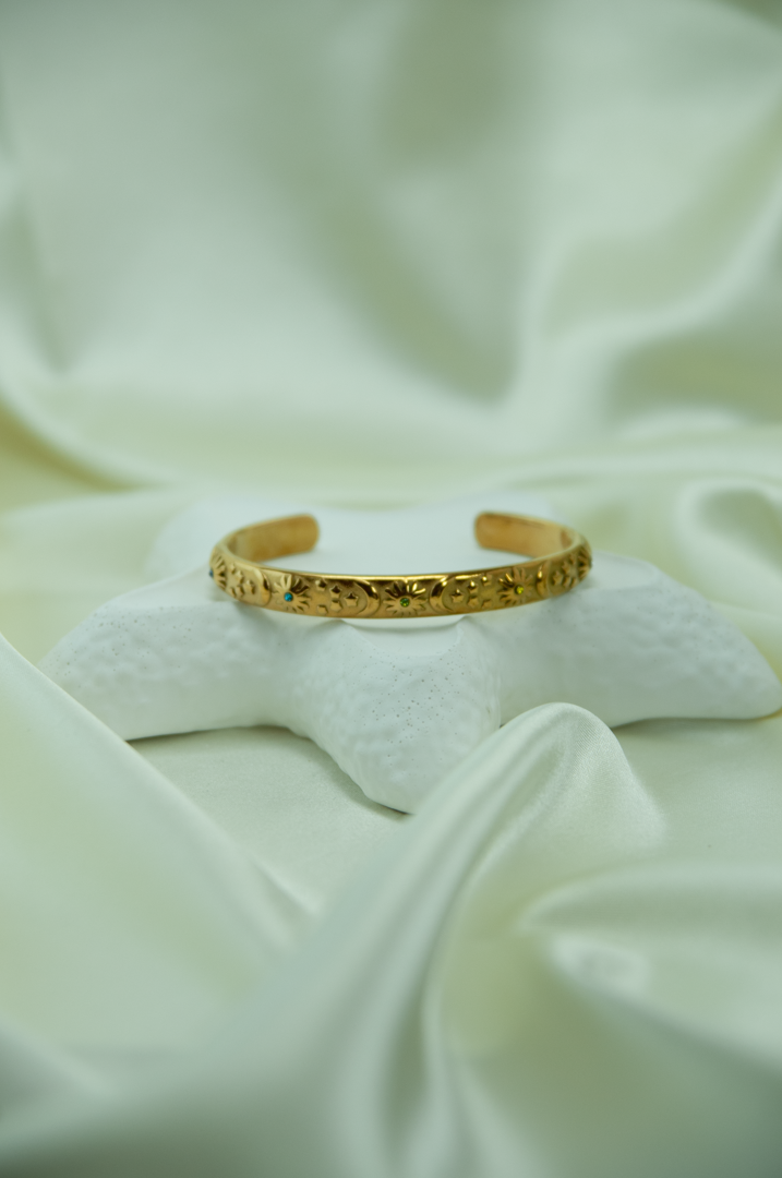 Doğadan ve gökyüzünden ilham alan bu özel tasarım kelepçe, detaylarındaki anlam ve işçilikle ön plana çıkıyor. Altın kaplamanın asaletini, antik sembollerin modern yorumuyla birleştiren bu parça, takı koleksiyonunuzun en karakteristik üyelerinden biri olmaya aday.