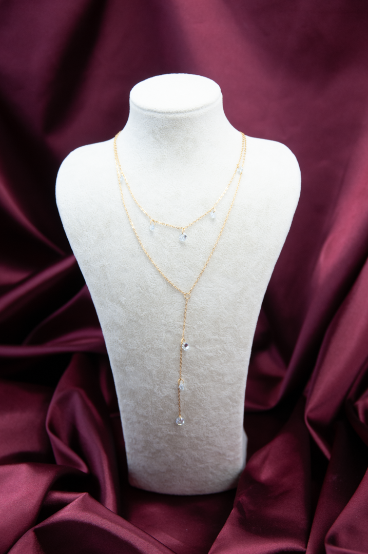 İki farklı boyuttaki ince gold zincirin, parlak taşlarla Y formunda birleştiği bu katmanlı kolye, şıklığı zahmetsizce boynunuza taşıyor. Hem modern hem de zarif duruşu sayesinde tek bir aksesuarla katmanlı kolye görünümü elde etmek isteyenler için mükemmeldir.