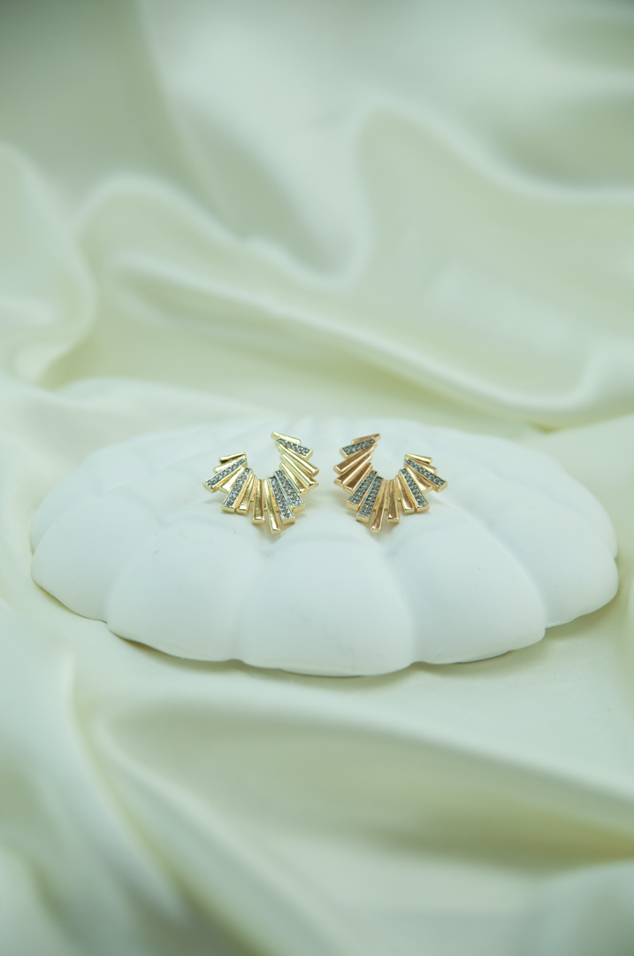 Gold tonlarında, modern yelpaze formunda tasarlanmış ve üst kısmı pırıltılı zirkon taşlarla süslenmiş bu küpe, sanatsal ve iddialı bir görünüm sunar. Geometrik çizgileri ve ışıltısı sayesinde özel davetlerinizde veya gece şıklığınızda odak noktası olmaya adaydır.